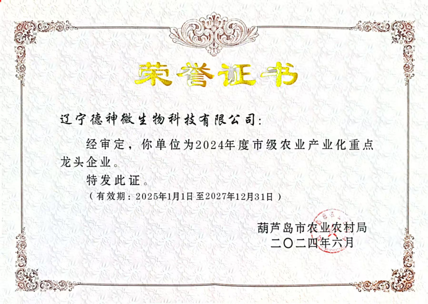 我企榮獲葫蘆島市級農(nóng)業(yè)產(chǎn)業(yè)化重點龍頭企業(yè)
